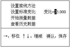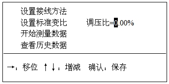 如果變壓器有檔位,按實(shí)際值設定,反之,設定為0.00%。按“確認”鍵保存調壓比后,返回主菜單。