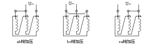 依次在任兩相之間加壓,同時(shí)非加壓側的三相出線(xiàn)端人工短連接。
