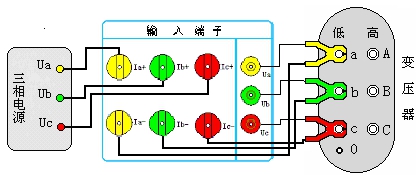 用三相調壓器作為試驗電源,將調壓器的輸出端接到容量測試儀的電流端子的正端;三把測試鉗的粗線(xiàn)按顏色分別接到測試儀的電流端子的負端;三把測試鉗的細線(xiàn)按顏色分別接到測試儀的電壓端子上。再將三把測試鉗夾到被測變壓器的高壓側接線(xiàn)柱上,黃鉗接A相柱、綠鉗接B相柱、紅鉗接C相柱。再用專(zhuān)用短路線(xiàn)把低壓側三個(gè)接線(xiàn)柱短接起來(lái),注意一定要良好短接,否則會(huì )影響測試數據。