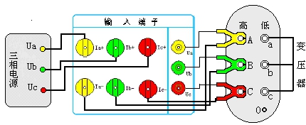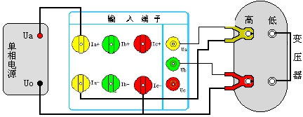用一單相電源作為測試電源,火線(xiàn)接到測試儀的A相電流端子正端,黃鉗子粗線(xiàn)接到A相電流端子的負端,細線(xiàn)接到A相電壓端子Ua,紅鉗子粗線(xiàn)直接接到測試電源的零線(xiàn),細線(xiàn)接到B相電壓端子Ub,兩把鉗子分別夾到低壓側兩個(gè)接線(xiàn)柱上。高壓側用專(zhuān)用短接線(xiàn)短接,注意一定要短接良好,否則會(huì )影響測試數據。