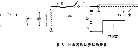 (4)直閃法的測試原理圖如圖2。在實(shí)際測試時(shí)利用高壓設備和本公司高壓測試裝置,按圖8所示線(xiàn)路連接。