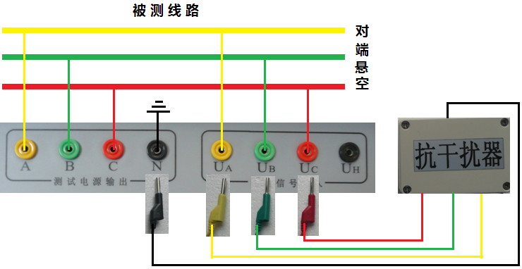 在進(jìn)行正序電容測試前必須測量線(xiàn)路的感應電壓,如果三相線(xiàn)路上有任意一相感應電壓超過(guò)100V,需將儀器所配的抗干擾并在面板上的UA、UB、UC和N之間,如圖。