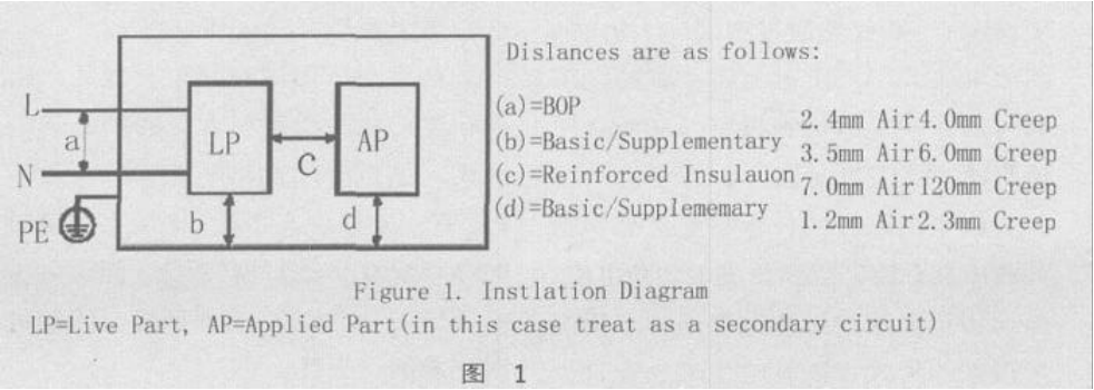 耐壓試驗設備的耐壓測試是一種無(wú)破壞性的測試,它用來(lái)檢測經(jīng)常發(fā)生的瞬態(tài)高壓下產(chǎn)品的絕緣能力是否合格。它在一定時(shí)間內施加高壓到被測試設備以確保設備的絕緣性能足夠強。進(jìn)行這項測試的另一個(gè)原因是它也可以檢測出儀器的一些缺陷,例如制造過(guò)程中出現的爬電距離不足和電氣間隙不夠等問(wèn)題。下圖是IEC60601-1中對儀器的絕緣距離的規定和一個(gè)常見(jiàn)的間隙不足的例子。