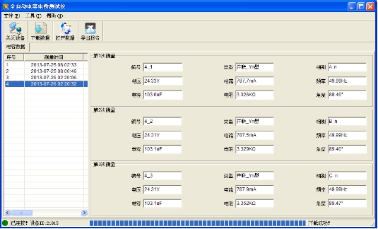 1.通信連接線(xiàn)連接好后,打開(kāi)儀器電源,待儀器進(jìn)入圖3.1所示主界面后,點(diǎn)擊“數據通信”,然后運行“全自動(dòng)電容電橋測試儀.exe”,如圖4.4所示。