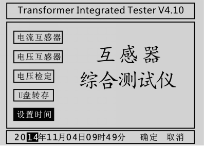首先將AC220V或AC380V電源連接至儀器面板,打開(kāi)面板上主電源開(kāi)關(guān),儀器進(jìn)入開(kāi)機畫(huà)面,開(kāi)機完成后儀器顯示如圖2.1所示畫(huà)面,進(jìn)入待機畫(huà)面后光標指示的當前試驗項目為電流互感器,當前選擇項目的背景會(huì )反色。按下旋轉鼠標即可進(jìn)入電流互感器測試界面,轉動(dòng)旋轉鼠標則可選中電壓互感器、電壓檢定、U盤(pán)轉存或設置時(shí)間。