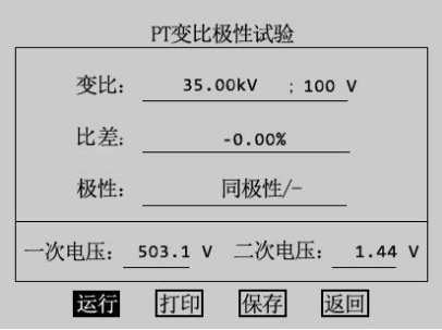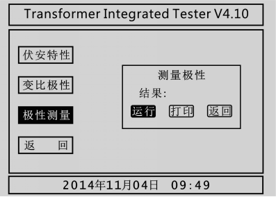 在PT測試主界面中光標選擇極性測量選項,點(diǎn)擊旋轉鼠標即可進(jìn)入PT變比極性測量界面如圖4.6所示:PT極性測量接線(xiàn)與PT變比極性試驗接線(xiàn)方式相同,按下運行按鈕進(jìn)行極性測量,測試完成后按下打印項,則打印極性測量結果,按下返回項則返回至PT試驗主界面。