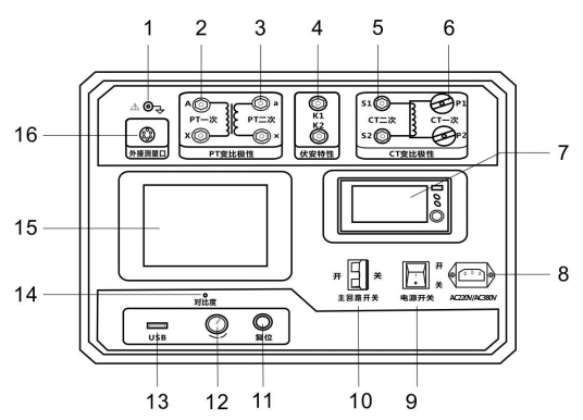 儀器面板如圖1.3所示,圖中標注如下: