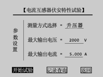 1.伏安特性升壓器參數設置:在電流互感器伏安特性試驗界面,如圖二所示。測量方式選擇:升壓器,最大輸出電壓和最大輸出電流根據被試品設定。