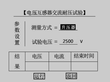 2.交流耐壓升壓器參數設置:在電流互感器交流耐壓試驗界面,如圖四所示。測量方式選擇:升壓器,試驗電壓根據試驗需求設定。設置原則:當交流耐壓試驗電壓大于1000V時(shí),測量方式選擇升壓器,此時(shí)儀器默認電壓為1500V。