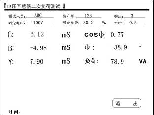 進(jìn)入該界面就可以測試電壓互感器負荷。測試人員及資產(chǎn)編號,可以進(jìn)行拼音或數字輸入。