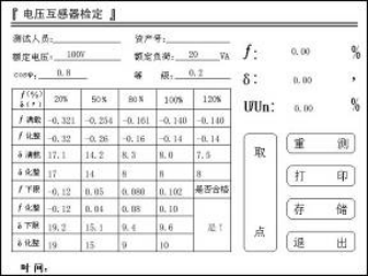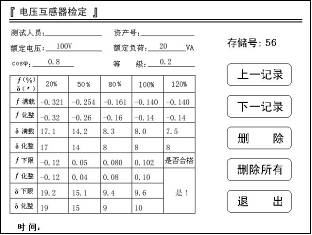 進(jìn)入電壓互感器檢定界面后,儀器自動(dòng)顯示比差、角差以及百分表,同時(shí)在升壓過(guò)程中儀器自動(dòng)把測試數據記錄到表格中,儀器自動(dòng)對數據進(jìn)行化整處理,所有的數據測量完成后,根據規程給出被測互感器誤差是否合格的結論。
