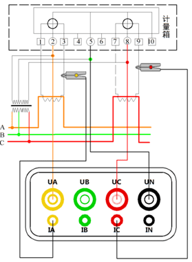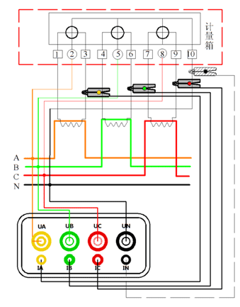 測量接線(xiàn)1、單相測量接線(xiàn)方式如下圖: 圖五、單相電接線(xiàn)方式 單相電測量將火線(xiàn)接到儀表的UA相,零線(xiàn)接到UN。電流鉗傳感器鉗到火線(xiàn)上接入IA插孔。2、三相三線(xiàn)接線(xiàn)方法如下圖: 圖六、三相三線(xiàn)接線(xiàn)示意圖 電壓線(xiàn)的連接:使用專(zhuān)用電壓測試線(xiàn)(黃、紅、黑三組),一端依次插入本儀器的UA、UC、UN相插孔,另一端分別接入被測線(xiàn)路的A相、C相、B相。 注意:黃色線(xiàn)接UA插孔,黑色線(xiàn)接UN插孔、紅色線(xiàn)接UC插孔。 電流線(xiàn)的連接:再將IA、IC鉗插入本儀器IA、IC插孔中,再將另一端分別卡入被測電流回路。3、三相四線(xiàn)接法如下圖: 圖七、三相四線(xiàn)接線(xiàn)示意圖 電壓線(xiàn)的連接:使用專(zhuān)用電壓測試線(xiàn)(黃、綠、紅、黑四組),一端依次插入本儀器的UA、UB、UC、UN相插孔中,另一端再接入被測線(xiàn)路的A相、B相、C相、零線(xiàn)。 電流線(xiàn)的連接:將 IA、IB、IC鉗表插入本儀器IA、IB、IC插孔中,再將另一端分別卡入被測電流回路。