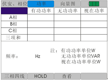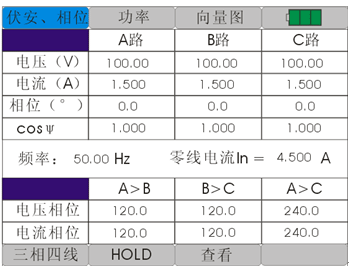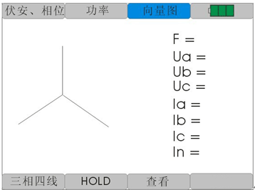 2、測量界面說(shuō)明開(kāi)機儀表自動(dòng)進(jìn)入測量界面如下: 圖二、伏安相位測量界面 如果測量方式選擇三相三線(xiàn),用觸摸筆輕觸圖標三相四線(xiàn)圖標會(huì )變成三相三線(xiàn),相同操作可實(shí)現單相測量。本儀表具有數據保持和保存功能,輕觸HOLD圖標,圖標顏色由灰色變成HOLD測量數據靜止,下面出現保存圖標,輕觸保存圖標,可以保存數據,數據保存采用循環(huán)保存新保存數據會(huì )自動(dòng)刪除最早保存的那組數據,查看功能可以查看保存數據紫色圖標會(huì )用R**(**代表01、02…10),通過(guò)上一頁(yè)圖標和下一頁(yè)圖標翻看數據。上述功能在功率測量界面同樣有效。請按圖標功率變成藍色如下圖進(jìn)入功率測量界面,保存數據時(shí)伏安相位測量數據同樣被保存。 圖三、功率測量界面 輕觸向量圖圖標進(jìn)入六角向量圖測量界面,六角圖按顏色畫(huà)出電壓和電流的矢量圖(A相電壓和電流為黃色、B相電壓和電流為綠色、C相電壓和電流為紅色)。 圖四、六角向量圖界面
